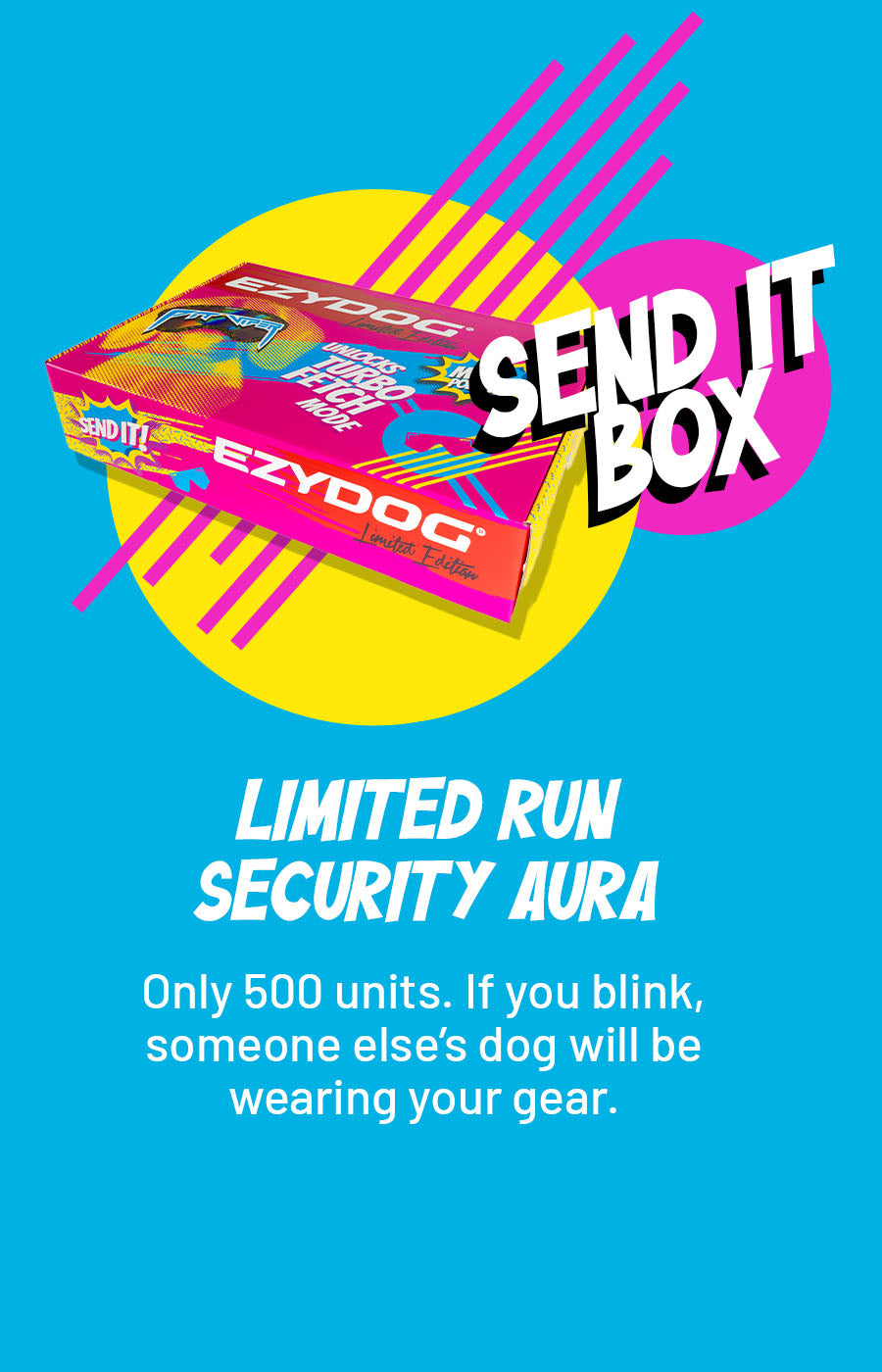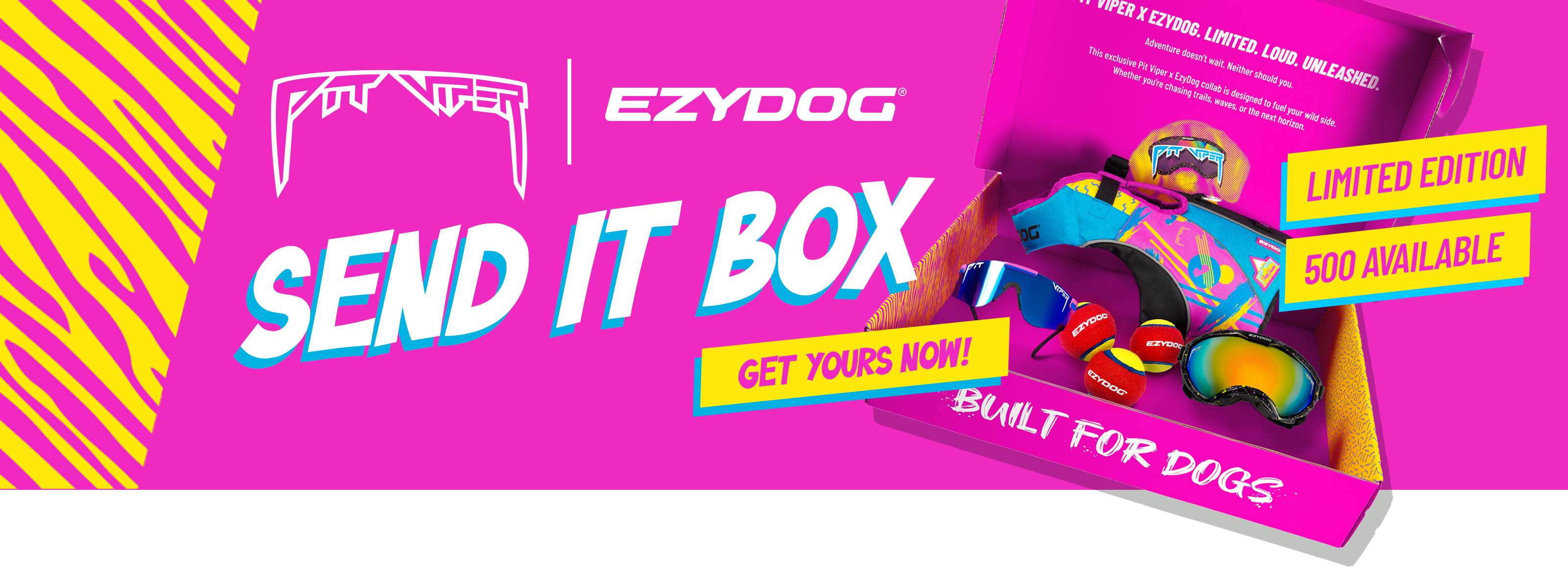 Only 500 Limited Edition Send It Boxes released. Each box includes dog goggles, a dog life jacket, a polarized Pit Viper lens, and an EzyDog squeaky tennis ball built for outdoor action across water, sand and trails.