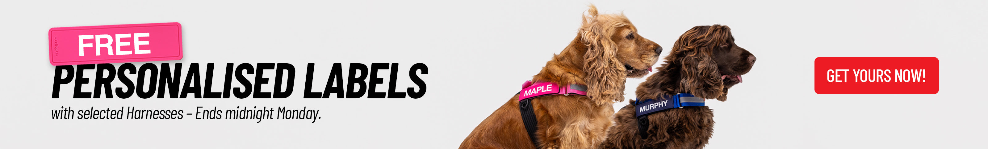 For a limited time, add a free set of Personalised Labels with any Express, FormFit, or Convert Harness. With 9 vibrant colours to choose from, you can customise your dog's Harness to match their unique personality and style!