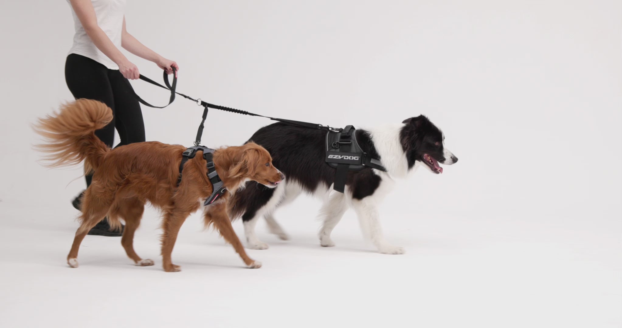 Rikki is wearing the X-Link Harness in size Medium. Ziggy is wearing the Convert Harness in size Large. Paired with Zero Shock Coupler.
