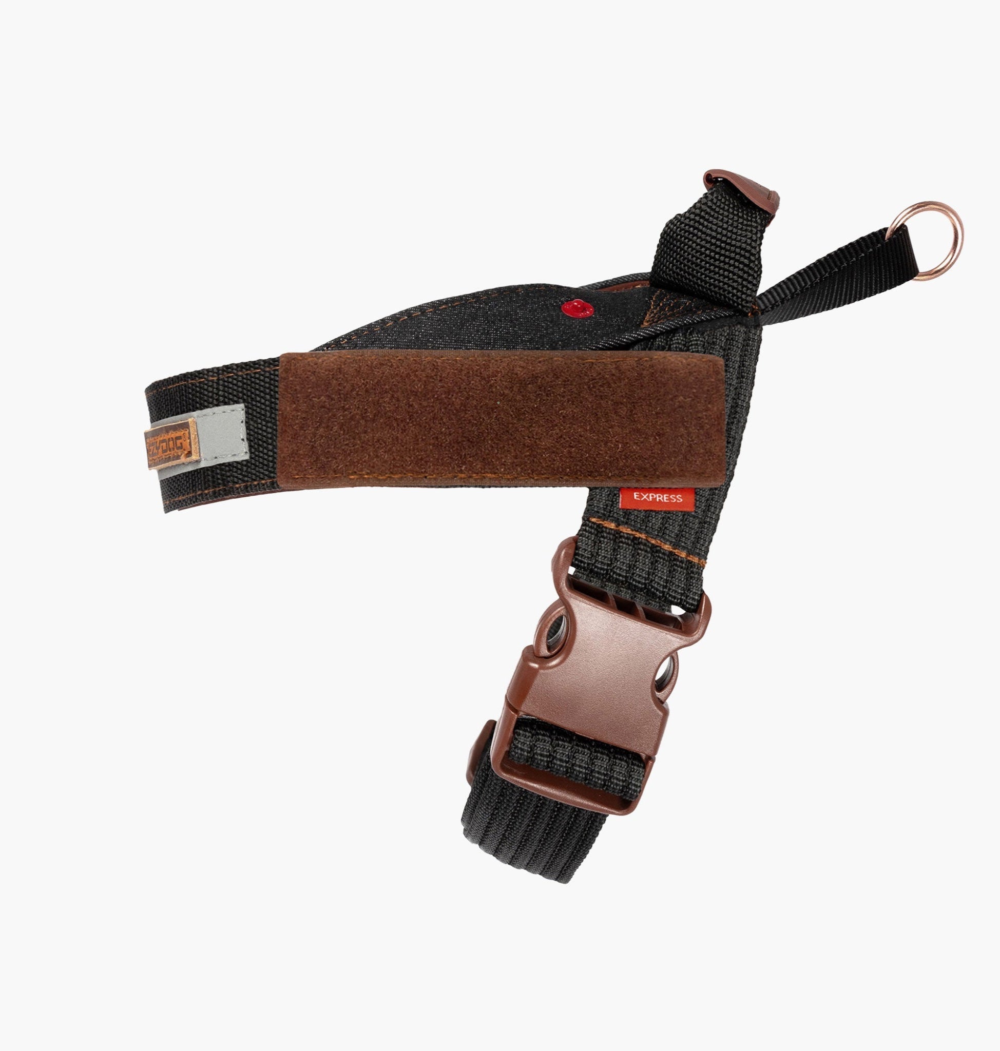 Enjoy daily versatility with the Express Harness. Featuring molded EVA foam padding, reflective trim, personalisable side labels, and durable denim for a distin